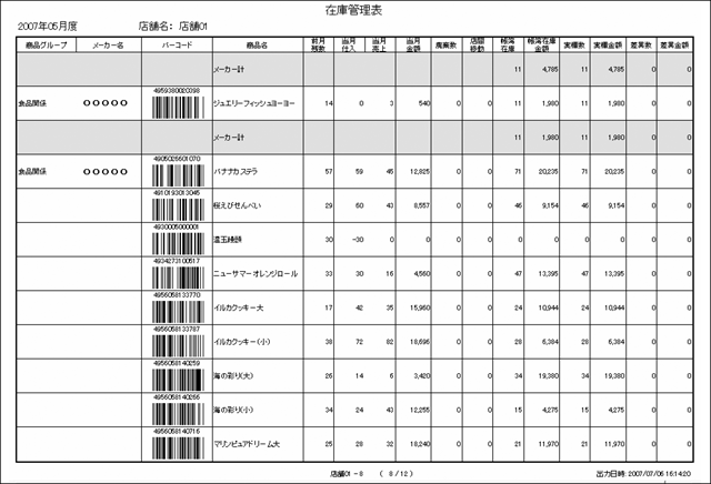 【在庫管理表】 グループ・部門・サブ部門別、メーカー、仕入先別などさまざまな条件で在庫状況を出力できます。バーコード付きの出力も可能です。ハンディターミナル(オプションの庫蔵)を利用するとさらに効率の良い棚卸業務が行えます。 |